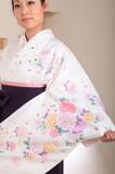 白地にパステルカラーのバラが描かれた二尺袖で、かわいらしさを演出!気品漂う紫の袴を合わせれば、キリッと引き締まった着こなしに。愛らしさのなかにも上品な雰囲気を覗かせる袴フルセットです。
