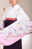 淡い色合いの二尺袖に紫の袴を合わせたフルセット。着物の優しい雰囲気が、清楚な女の子らしさを演出してくれます。高級感のある袴をコーディネートして、上品さもプラス。