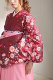 二尺袖は、エンジに桜の柄が上品でキュート!ピンクの袴を合わせて、女の子らしさをより一層際立てた着こなしに。大人カワイイフルセットです。