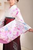 二尺袖は白地に優しい色合いの花々が描かれており、清楚なイメージを与えます。エンジの袴を合わせて、かわいらしさの中に上品さを感じさせる着こなしに。