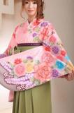 かわいいピンクの二尺袖に、うぐいす色の袴を組み合わせたフルセット。着物の柄行きは、高貴な辻が花文様を描いております。おしとやかで古典的な雰囲気の着こなし。
