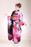 黒地に美しく描かれた花々が印象的な、とてもゴージャスな振袖。成人式はいつもより豪華で大胆に着飾りたいあなたにオススメのフルセット!
