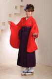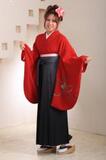 シンプルな赤地の二尺袖に、かわいらしい桜の刺繍入りの袴をコーディネート。スッキリとしていて大人っぽい印象を与えます。
