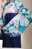 卒業式はとびきりゴージャスに着飾りたい方にオススメ!大胆なバラの花々が印象的な二尺袖に、爽やかな青の袴を合わせました。クールで大人なフルセット。
